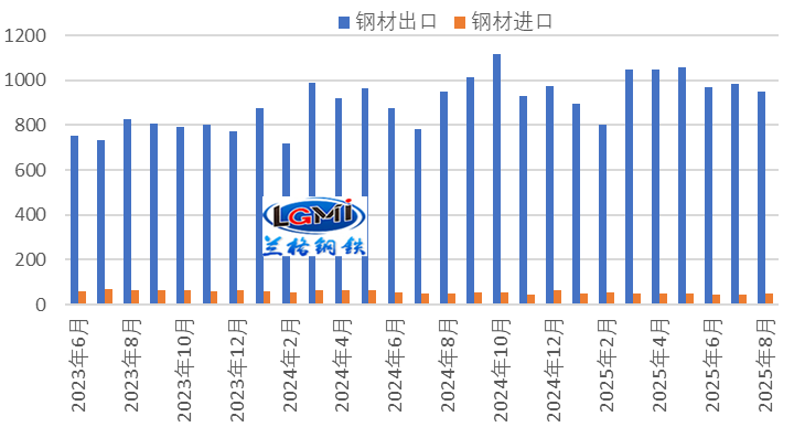 2025年8月我國鋼材月度出口呈現(xiàn)同比微幅增長態(tài)勢。據(jù)海關(guān)總署統(tǒng)計數(shù)據(jù)顯示,出口方面,8月份,我國出口鋼材951.0萬噸,同比增長0.1%,增幅較上月回落25.5個百分點;1-8月,我國出口鋼材7749.0萬噸,同比增長10.0%,增幅較上月回落1.4個百分點。進口方面,8月份,我國進口鋼材50.0萬噸,同比下降2.0%,降速較上月收窄7.6個百分點;1-8月,我國進口鋼材397.7萬噸,同比下降14.1%,降幅較上月收窄1.6個百分點。