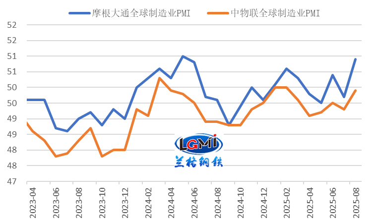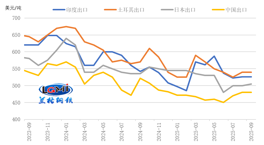2025年8月份,我國鋼材出口同比呈微幅增長態(tài)勢(詳見圖1),環(huán)比有所回落,較上月減少32.6萬噸,環(huán)比下降3.3%,鋼材進口雖環(huán)比有所回升、同比降幅收窄,但仍處于低位水平,因而8月份我國鋼材對外貿(mào)易仍保持明顯凈出口態(tài)勢,但凈出口同比增速大幅回落。蘭格鋼鐵研究中心測算數(shù)據(jù)顯示,8月份,我國凈出口鋼材901.0萬噸,同比增長0.2%,增速較上月回落27.8個百分點;1-8月份,我國凈出口鋼材7351.3萬噸,同比增長11.5%,增速較上月回落1.5個百分點。當前我國鋼材出口仍保持價格優(yōu)勢,全球制造業(yè)指數(shù)回升,制造業(yè)外需景氣度略有改善,鋼鐵企業(yè)出口訂單指數(shù)回升至擴張區(qū)間,短期內(nèi)對鋼材出口有一定拉動;但全球粗鋼產(chǎn)量有所回升,疊加貿(mào)易摩擦及相關(guān)稅費增加仍將抑制鋼材出口。在上年同期鋼材出口基數(shù)繼續(xù)增加(2024年9月鋼材出口1015萬噸)的情況下,9月份我國鋼材出口同比或面臨回落壓力。相關(guān)影響因素分析如下:1、我國鋼鐵出口價格優(yōu)勢仍存當前我國鋼材出口價格優(yōu)勢仍存。蘭格鋼鐵研究中心監(jiān)測數(shù)據(jù)顯示,截至2025年9月8日,印度、土耳其、日本熱軋卷板出口報價(FOB)分別為525美元/噸、540美元/噸和505美元/噸,中國熱軋卷板出口報價(FOB)為480美元/噸;目前我國熱卷出口報價分別較印度、土耳其、日本低45美元/噸、60美元/噸和25美元/噸(詳見圖2)。