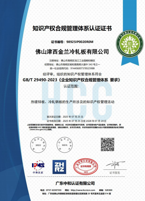 近日,津西金蘭成功通過《企業(yè)知識產(chǎn)權(quán)合規(guī)管理體系要求》(GB/T 29490-2023)認(rèn)證并獲得認(rèn)證證書。這標(biāo)志著津西金蘭在知識產(chǎn)權(quán)創(chuàng)造、運用、保護(hù)及管理領(lǐng)域邁上了規(guī)范化、標(biāo)準(zhǔn)化、系統(tǒng)化的新階段,為公司持續(xù)提升創(chuàng)新能力和核心競爭力奠定堅實基礎(chǔ)。