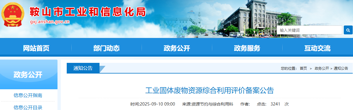 按照工信部《工業(yè)固體廢物資源綜合利用評(píng)價(jià)管理暫行辦法》、《國(guó)家工業(yè)固體廢物資源綜合利用產(chǎn)品目錄》、省工信廳《遼寧省工業(yè)和信息化廳關(guān)于做好工業(yè)固體廢物資源綜合利用評(píng)價(jià)工作的通知》(遼工信資源〔2023〕129號(hào))及《鞍山市工業(yè)固體廢物資源綜合利用評(píng)價(jià)管理實(shí)施辦法》要求,2025年9月3日-2025年9月9日,我局對(duì)鞍山廈美環(huán)??萍加邢薰?、鞍山昊通新材料有限公司、鞍鋼綠色資源科技有限公司工業(yè)固體廢物綜合利用評(píng)價(jià)進(jìn)行備案公示。截至公示期結(jié)束,未收到不同意見,現(xiàn)予以公布。