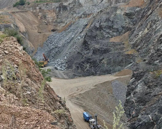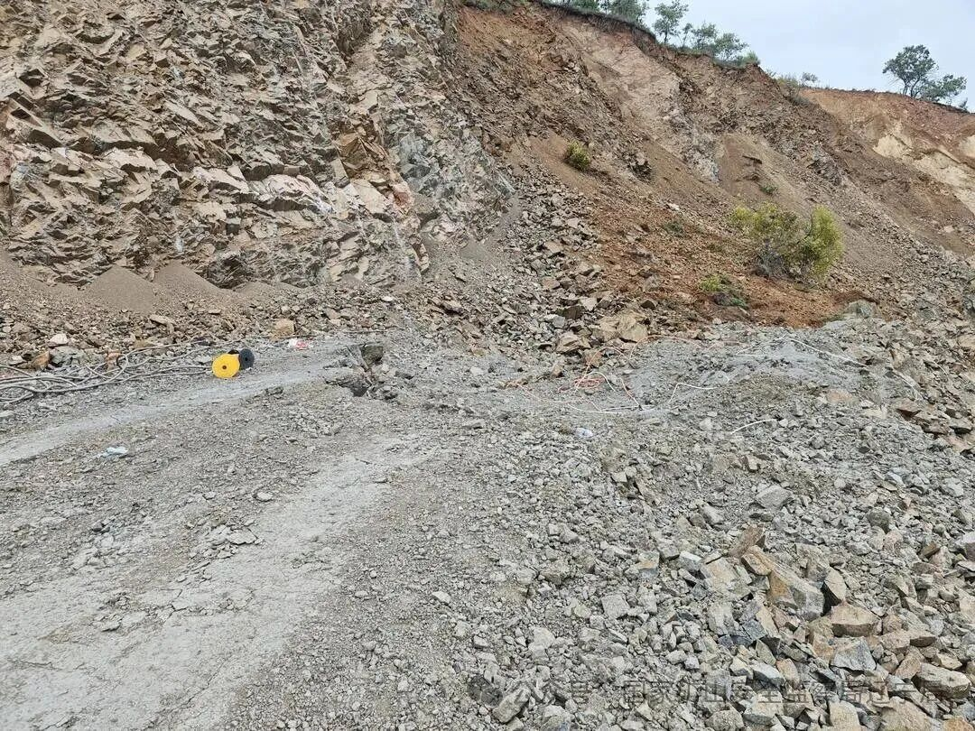 結(jié)束第一處現(xiàn)場處置下山途中,帶隊(duì)負(fù)責(zé)人又觀察到對面山上有可疑的大型車輛通行痕跡,在沿一條岔路上山途中,發(fā)現(xiàn)路上水泥地殘留的黑色大型輪胎印,立即帶領(lǐng)監(jiān)察員循跡追蹤。步行至山頂發(fā)現(xiàn),一個(gè)廢石傾倒場地赫然出現(xiàn),鏟車和運(yùn)礦車正在邊坡傾倒廢石。監(jiān)察人員跟隨這輛運(yùn)礦車,最終發(fā)現(xiàn)一個(gè)作業(yè)條件極其危險(xiǎn)的深坑開采點(diǎn),坑內(nèi)有挖掘機(jī)、運(yùn)礦車正在裝車作業(yè),附近還停放一臺(tái)專業(yè)鑿巖臺(tái)車。