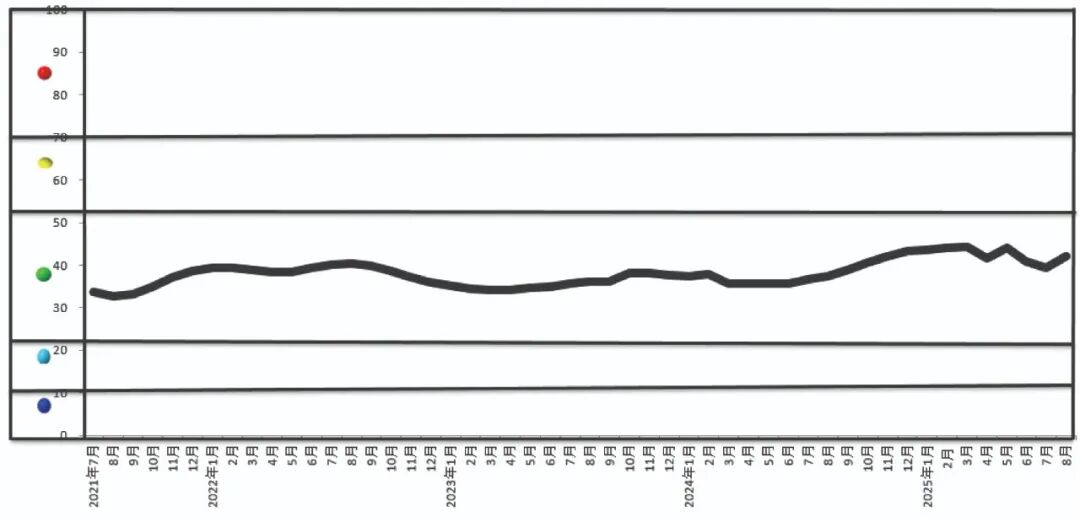 中國銅產(chǎn)業(yè)月度景氣指數(shù)監(jiān)測模型結(jié)果顯示,2025年8月份,中國銅產(chǎn)業(yè)月度景氣指數(shù)為42.0,較上月上升2.7個百分點,繼續(xù)保持在“正?!眳^(qū)間運行;先行指數(shù)為79.6,較上月下降0.1個百分點;一致指數(shù)為78.2,較上月上升4.4個百分點。最近13個月中國銅產(chǎn)業(yè)月度景氣指數(shù)見下表。