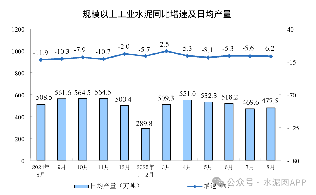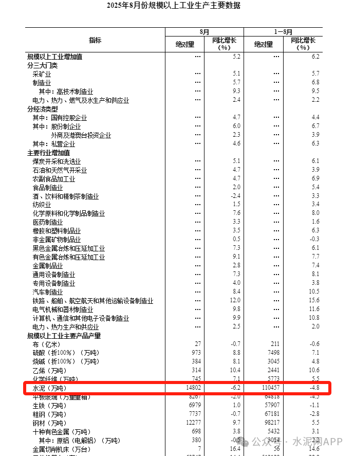 據(jù)國家統(tǒng)計(jì)局?jǐn)?shù)據(jù),8月份,規(guī)模以上工業(yè)增加值同比實(shí)際增長5.2%(增加值增速均為扣除價(jià)格因素的實(shí)際增長率)。從環(huán)比看,8月份,規(guī)模以上工業(yè)增加值比上月增長0.37%。1—8月份,規(guī)模以上工業(yè)增加值同比增長6.2%。其中水泥行業(yè)8月份全國水泥產(chǎn)量14802萬噸,同比下降6.2%;1-8月全國水泥產(chǎn)量110457萬噸,同比下降4.8%。此外,數(shù)據(jù)顯示,2024年1-8月全國水泥產(chǎn)量為115907萬噸,由此計(jì)算,今年1-8月水泥全口徑產(chǎn)量比去年同期減少5450萬噸,降幅4.7%。