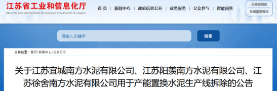 9月12日,江蘇省工信廳發(fā)布“關(guān)于江蘇宜城南方水泥有限公司、江蘇陽羨南方水泥有限公司、江蘇徐舍南方水泥有限公司用于產(chǎn)能置換水泥生產(chǎn)線拆除的公告”。