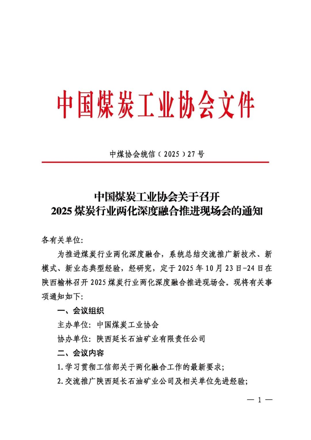 中國煤炭工業(yè)協(xié)會(huì)關(guān)于召開2025煤炭行業(yè)兩化深度融合推進(jìn)現(xiàn)場(chǎng)會(huì)的通知