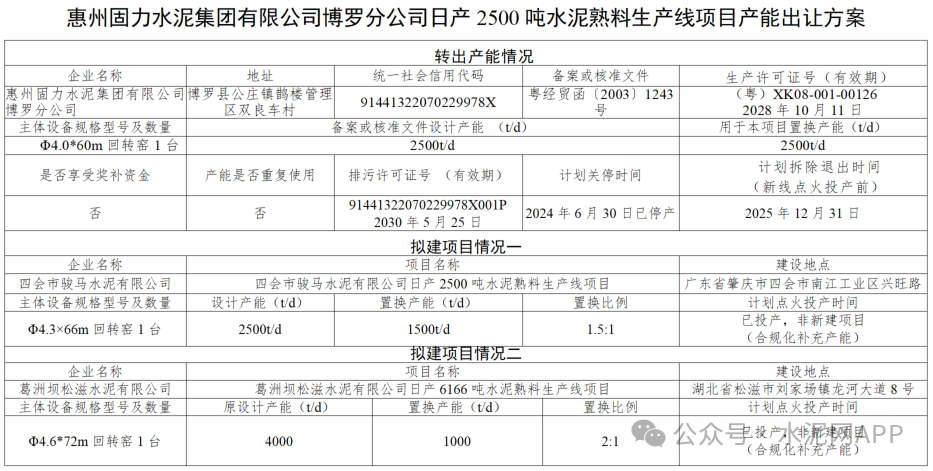 產(chǎn)能置換方案顯示,惠州固力水泥集團有限公司博羅分公司轉(zhuǎn)出一條2500t/d熟料產(chǎn)能,其中1500t/d產(chǎn)能用于補充四會市駿馬水泥生產(chǎn)線,1000t/d產(chǎn)能用于補充葛洲壩松滋水泥生產(chǎn)線。