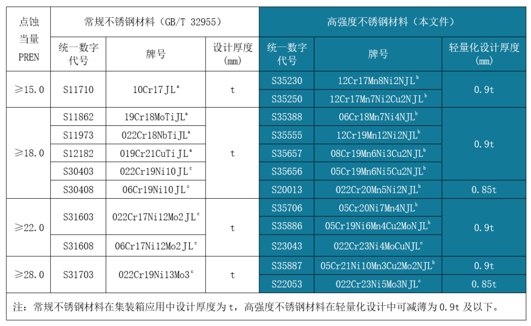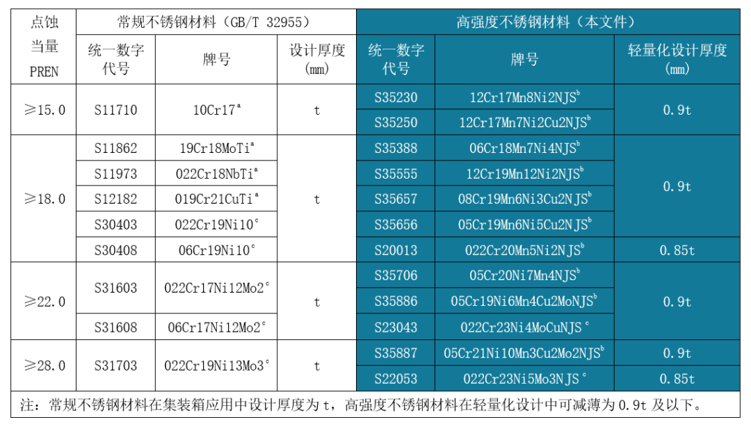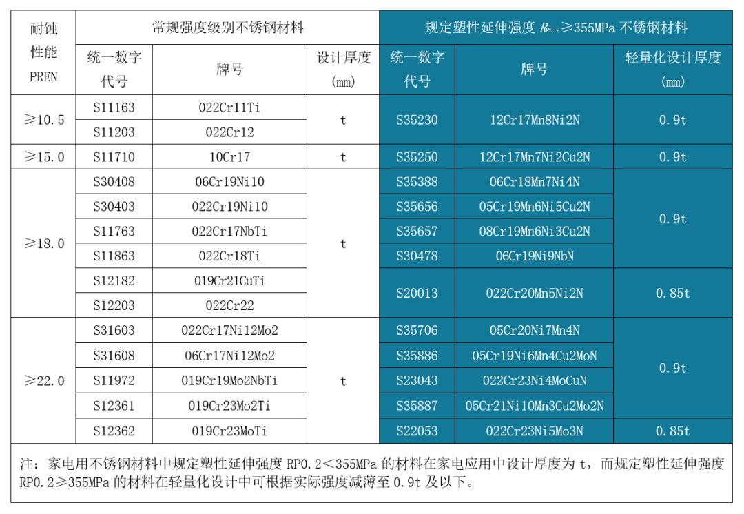 經(jīng)濟(jì)型高強(qiáng)度不銹鋼,包括QN系列奧氏體不銹鋼及QD2001雙相不銹鋼在保持良好耐蝕性、焊接性和冷加工性的基礎(chǔ)上顯著提升了強(qiáng)度,可助推集裝箱及家電等領(lǐng)域的產(chǎn)品輕量化設(shè)計(jì)。新發(fā)布的行業(yè)標(biāo)準(zhǔn)中推薦,高強(qiáng)度不銹鋼相對(duì)常規(guī)產(chǎn)品可減薄10%-15%(詳見表1~表3),這對(duì)于產(chǎn)業(yè)鏈節(jié)能減排和可持續(xù)綠色發(fā)展具有重要意義。