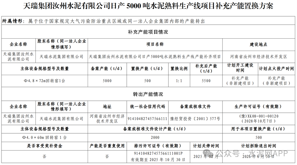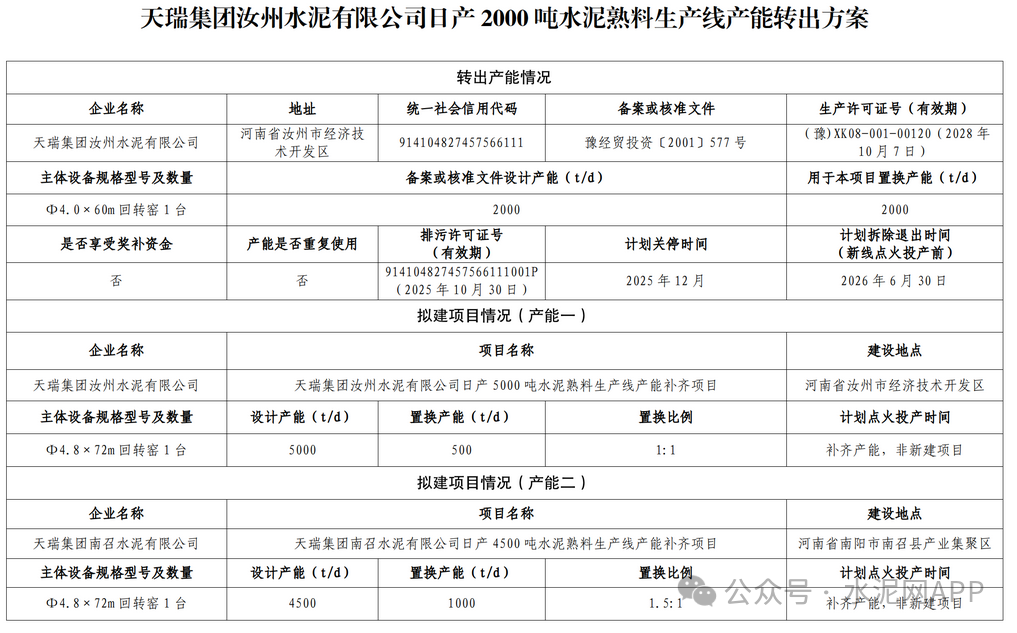 天瑞集團汝州水泥轉(zhuǎn)出一條2000t/d熟料生產(chǎn)線,其中500t/d產(chǎn)能用于補充同廠區(qū)一條5000t/d熟料生產(chǎn)線,置換比例1:1,1500t/d用于補充天瑞集團南召水泥一條4500t/d產(chǎn)能,置換比例1.5:1。