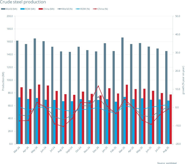 2025年8月全球70個(gè)納入世界鋼鐵協(xié)會統(tǒng)計(jì)國家/地區(qū)的粗鋼產(chǎn)量為1.453億噸,同比提高0.3%
