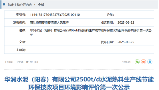 近日,廣東省陽(yáng)江市陽(yáng)春市春灣鎮(zhèn)人民政府網(wǎng)站發(fā)布了華潤(rùn)水泥(陽(yáng)春)有限公司2500t/d水泥熟料生產(chǎn)線節(jié)能環(huán)保技改項(xiàng)目環(huán)境影響評(píng)價(jià)第一次公示。