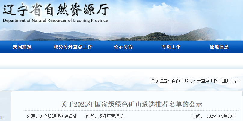 按照《關(guān)于進(jìn)一步加強(qiáng)綠色礦山建設(shè)的通知》(自然資規(guī)〔2024〕1號(hào))和《自然資源部辦公廳關(guān)于開展新一批國(guó)家級(jí)綠色礦山遴選工作的通知》(自然資辦發(fā)〔2025〕8號(hào))相關(guān)要求,遼寧省自然資源廳嚴(yán)格組織開展國(guó)家級(jí)綠色礦山遴選推薦工作。經(jīng)企業(yè)自主申報(bào)、省廳綜合評(píng)審,現(xiàn)擇優(yōu)確定5家企業(yè)作為2025年國(guó)家級(jí)綠色礦山遴選推薦對(duì)象,具體名單詳見附件。