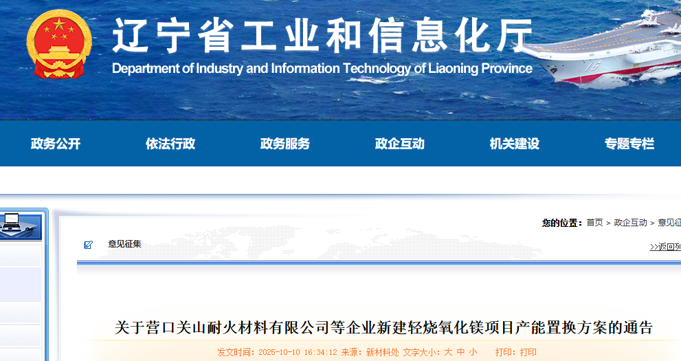 按照《遼寧省人民政府辦公廳關(guān)于推進(jìn)菱鎂行業(yè)高質(zhì)量發(fā)展的實(shí)施意見》(遼政辦發(fā)〔2023〕15號)、《遼寧省菱鎂礦浮選及鎂砂行業(yè)產(chǎn)能置換辦法》(遼工信建材〔2024〕18號)要求,根據(jù)菱鎂行業(yè)專項(xiàng)整治工作進(jìn)展,經(jīng)企業(yè)申請、市級審核、省級復(fù)核,我廳于2025年9月19日至10月9日,對營口關(guān)山耐火材料有限公司等企業(yè)新建輕燒氧化鎂項(xiàng)目產(chǎn)能置換方案進(jìn)行了公示,公示期間營口關(guān)山耐火材料有限公司等12家企業(yè)無異議,現(xiàn)予通告。