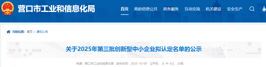 按省工信廳《關(guān)于做好2025年度創(chuàng)新型中小企業(yè)申報工作的通知》要求,經(jīng)企業(yè)登錄優(yōu)質(zhì)中小企業(yè)梯度培育平臺自愿申報,各縣(市)區(qū)、園區(qū)工信主管部門推薦,營口市工信局初審,擬認定營口創(chuàng)巖耐火材料有限公司等7家企業(yè)為2025年第三季度創(chuàng)新型中小企業(yè),現(xiàn)將通過名單予以公示。任何單位或個人對公示有異議的,可在公示期內(nèi)與市工信局聯(lián)系。