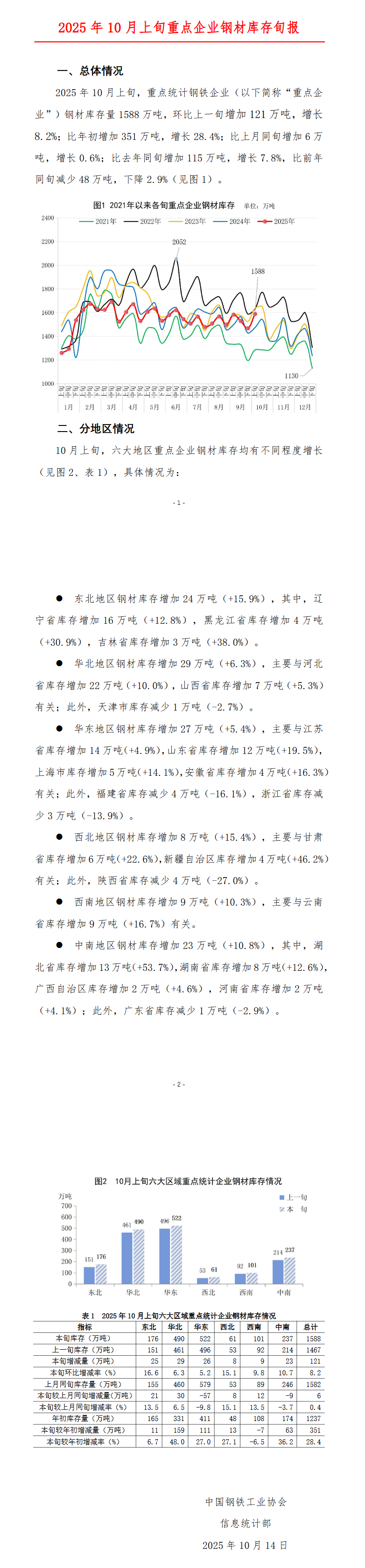 2025年10月上旬,重點統(tǒng)計鋼鐵企業(yè)鋼材庫存量1588萬噸,環(huán)比上一旬增加121萬噸,增長8.2%;比年初增加351萬噸,增長28.4%;比上月同旬增加6萬噸,增長0.6%;比去年同旬增加115萬噸,增長7.8%,比前年同旬減少48萬噸,下降2.9%。