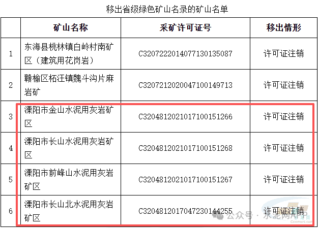 近日,江蘇省自然資源廳發(fā)布關(guān)于將贛榆區(qū)柘汪鎮(zhèn)魏斗溝片麻巖礦等6家礦山移出省級綠色礦山名錄的公告,其中包含4家水泥用礦山。