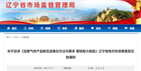《溫室氣體產(chǎn)品碳足跡量化方法與要求 菱鎂耐火制品》遼寧省地方標(biāo)準(zhǔn)草案已完成,現(xiàn)公開征求意見。請于2025年11月17日前,將意見反饋至遼寧省市場監(jiān)督管理局標(biāo)準(zhǔn)處。