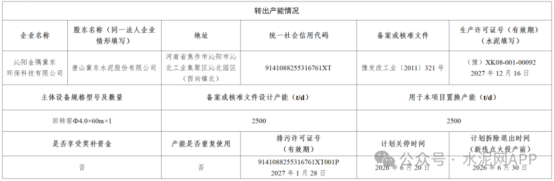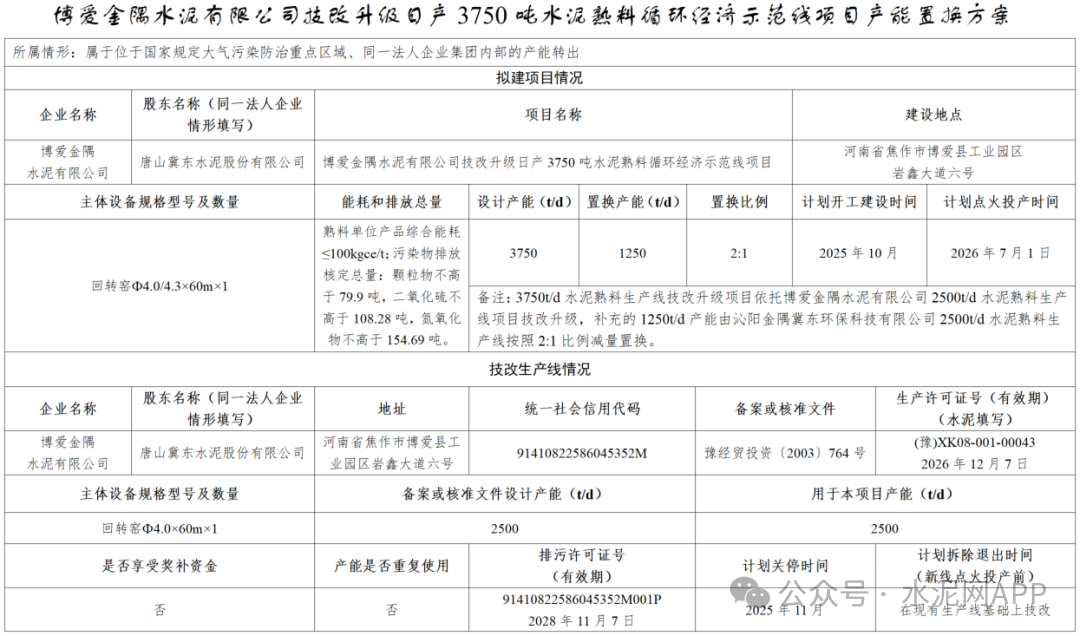 置換方案顯示,博愛金隅3750t/d水泥熟料生產(chǎn)線技改升級項目依托博愛金隅水泥有限公司2500t/d水泥熟料生產(chǎn)線項目技改升級,補充的1250t/d產(chǎn)能由沁陽金隅冀東環(huán)??萍加邢薰?500t/d水泥熟料生產(chǎn)線按照2:1比例減量置換。