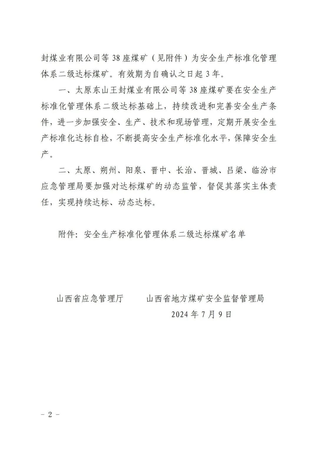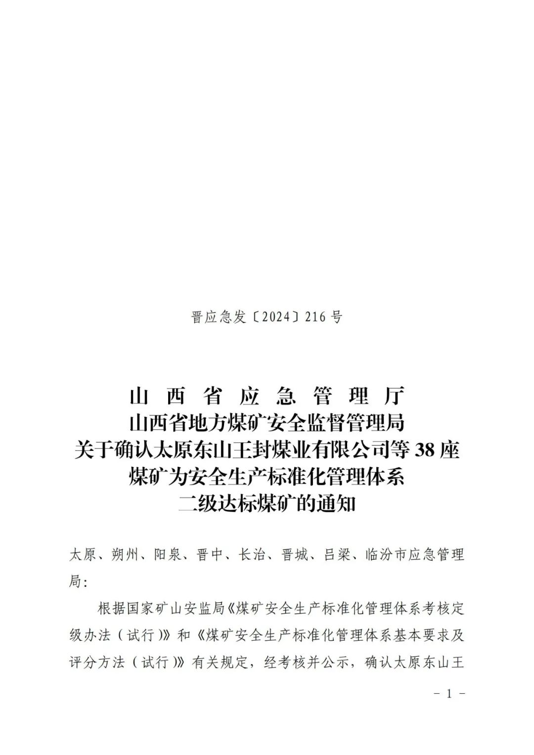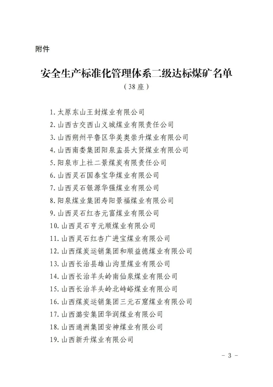 山西38座煤礦為安全生產標準化管理體系二級達標煤礦