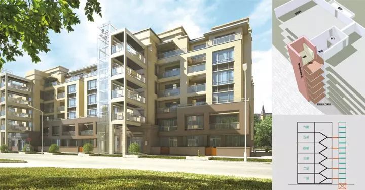 樓梯轉(zhuǎn)角處上下打通并重新改造成旋轉(zhuǎn)樓梯銜接上下層樓梯,電梯轎廂設(shè)置在室內(nèi)休息平臺空間,直接到達目的樓層。